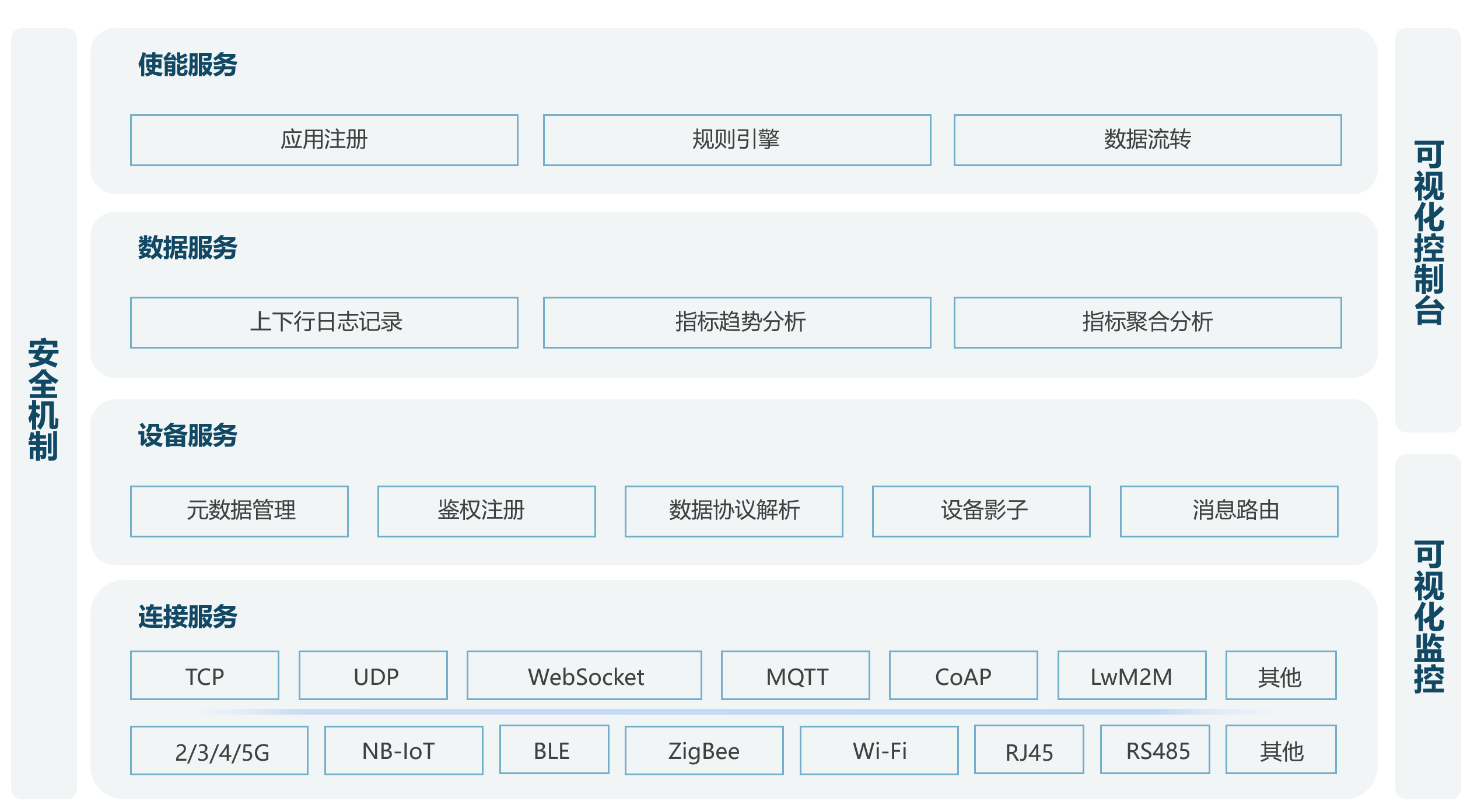 - 连接服务:提供设备联网功能,支持设备通过各种无线或有线的通信方式接入网络,并支持各种网络传输协议;