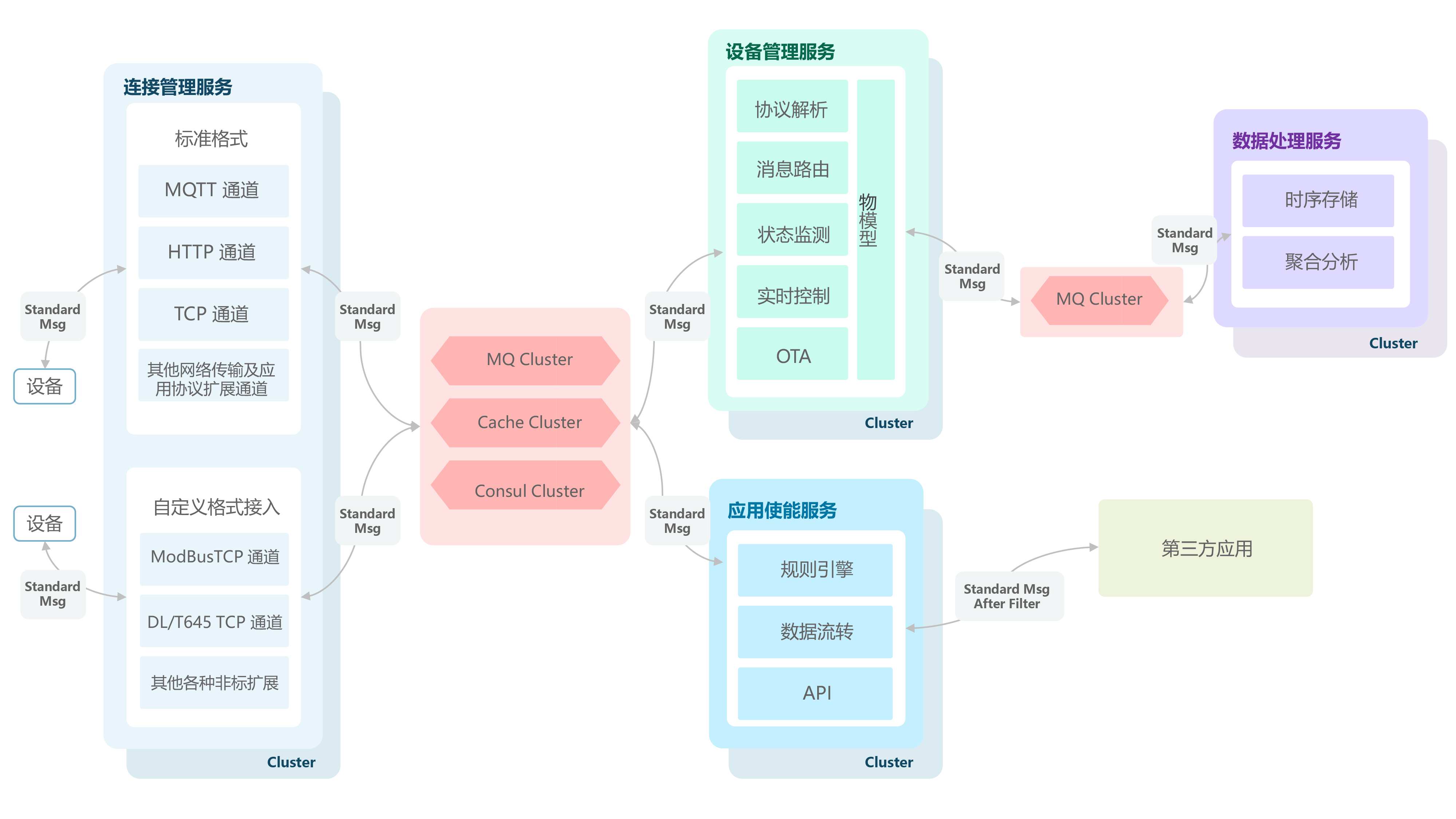 - 设备服务:提供设备基础管理功能,包括设备的鉴权管理、数据协议解析、消息路由、设备影子数据及元数据管理功能;