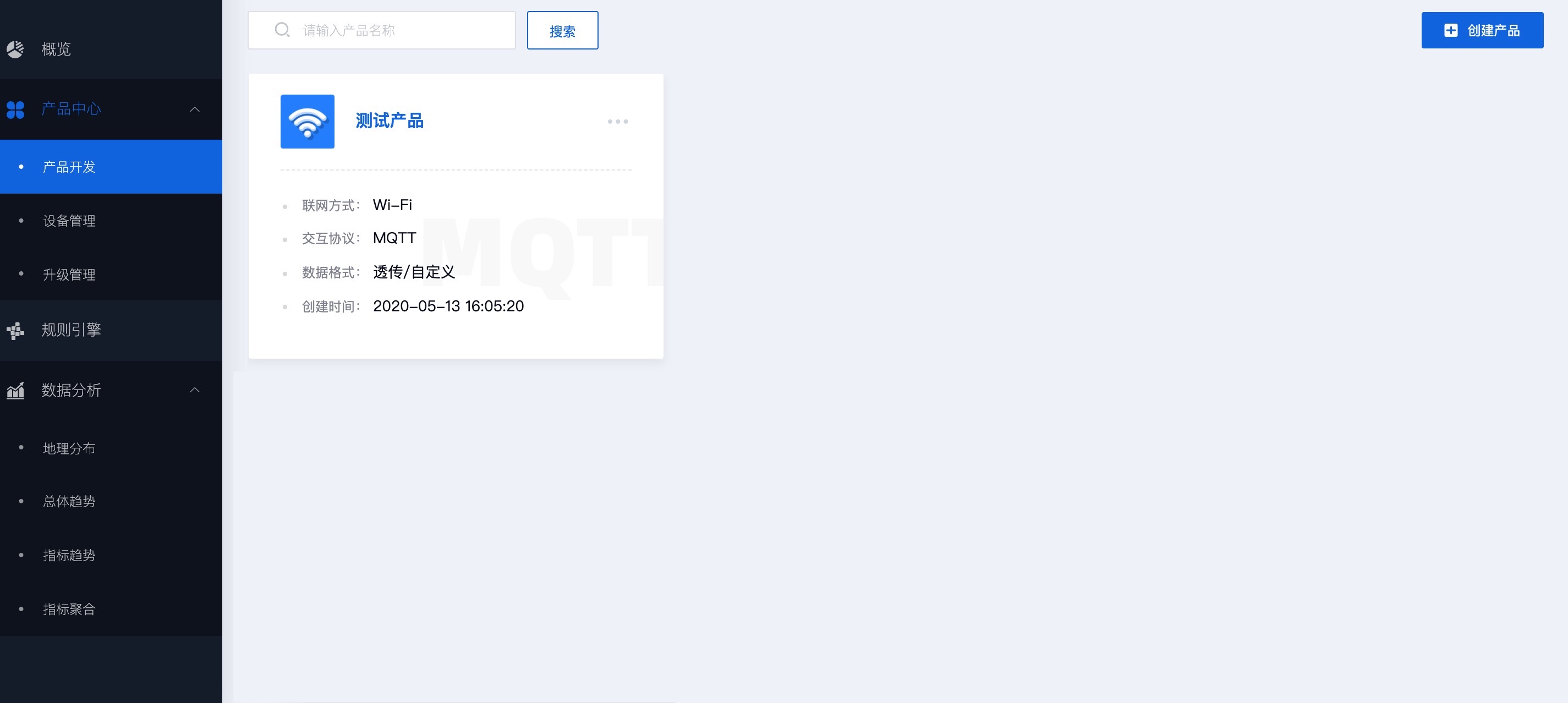用户登录平台后,点击左侧导航栏的“产品中心”-“产品开发”菜单,可以看到账户下所创建的所有产品列表,在这个页面,用户可以创建新的产品,也可以编辑和删除已有产品。
