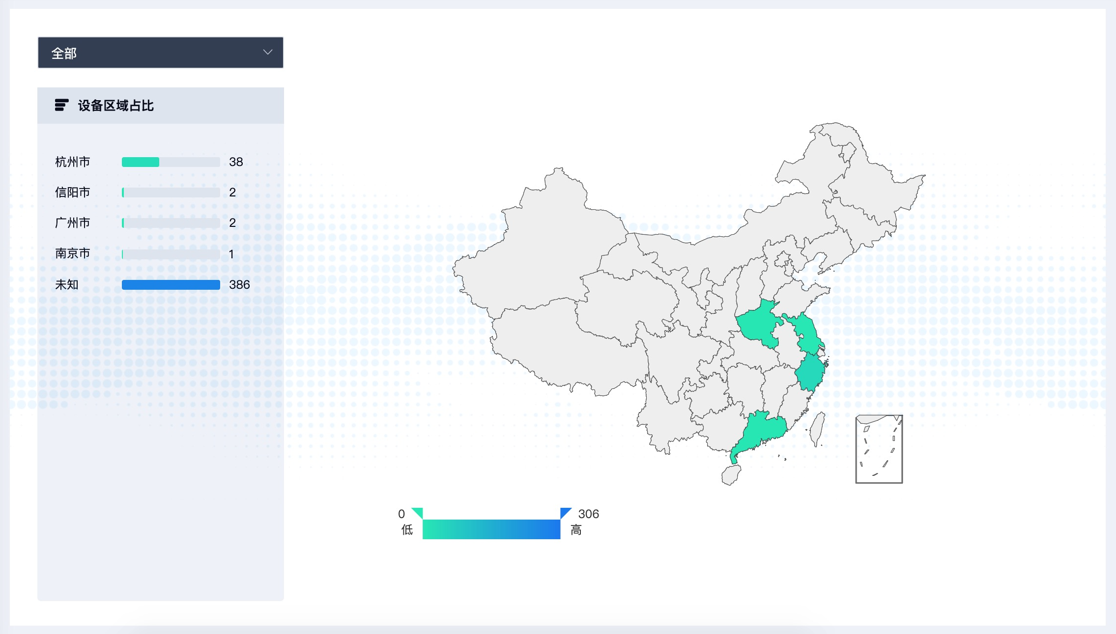 1. 设备区域占比:统计所选产品下所有设备的省市分布,未设置地理位置信息的设备归入“其他”范畴;
