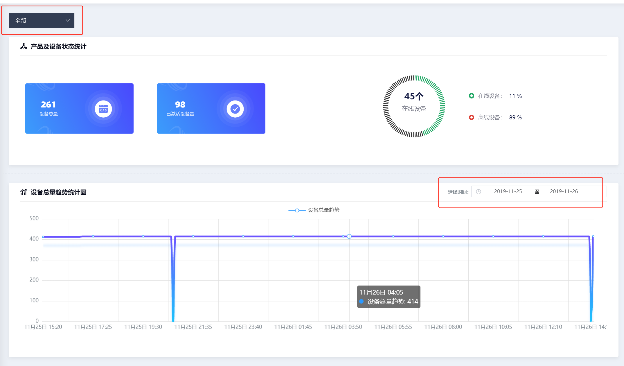总体趋势统计主要统计设备数量随时间的变化趋势,左上角的下拉选择框可以选择不同的设备,默认统计所有设备下的设备数量变化趋势。