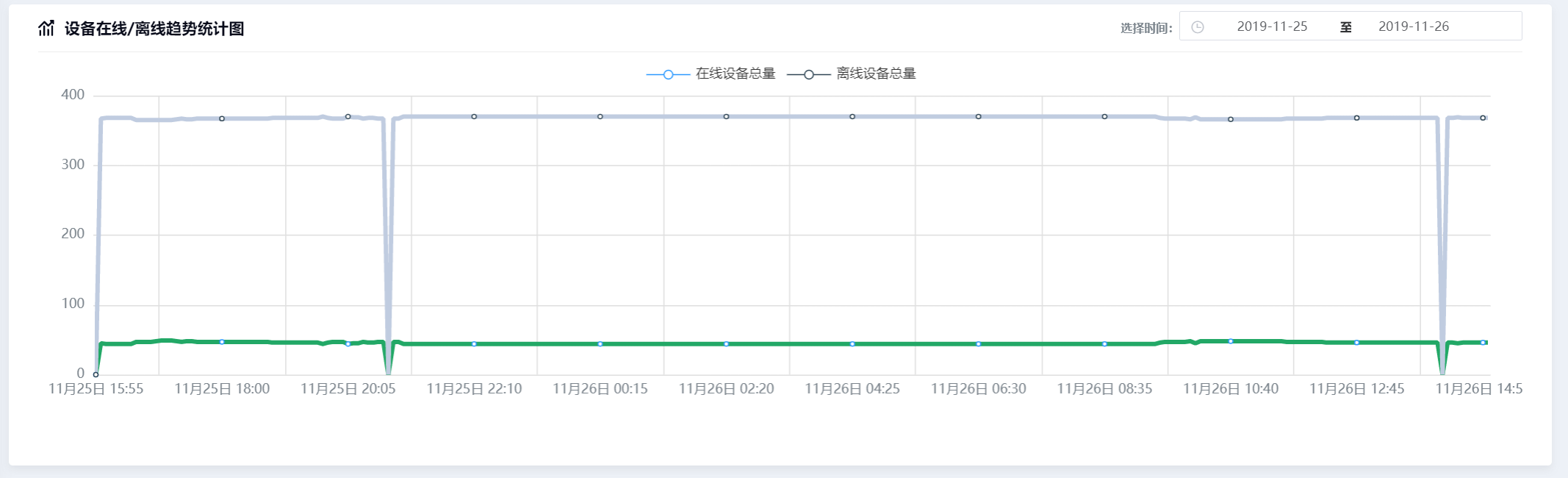 3. 设备在线、离线趋势统计图:统计每日设备在线离线数量变化趋势,点击右上角日期选择框可切换统计不同日期范围内的设备变化。时间范围最大可选7天,统计点为每5分钟的瞬时情况。