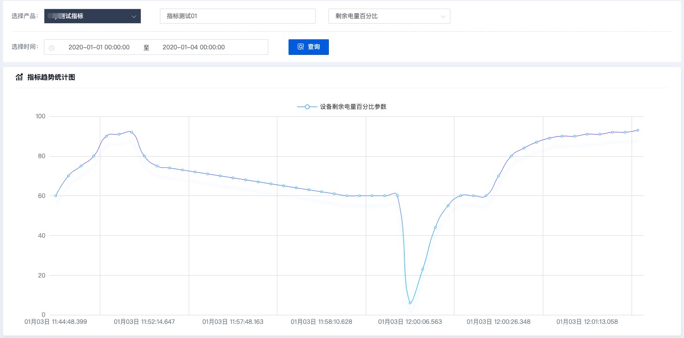 指标趋势功能表达的是某一设备的具体参数原始值的变化趋势。进行指标分析时,产品、设备、对应参数和时间范围均为必要值。