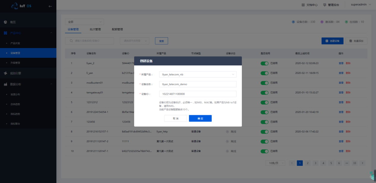 登录 IoTOS 平台,进入 产品中心 - 设备管理 页面,点击 创建设备 按钮,如下图: