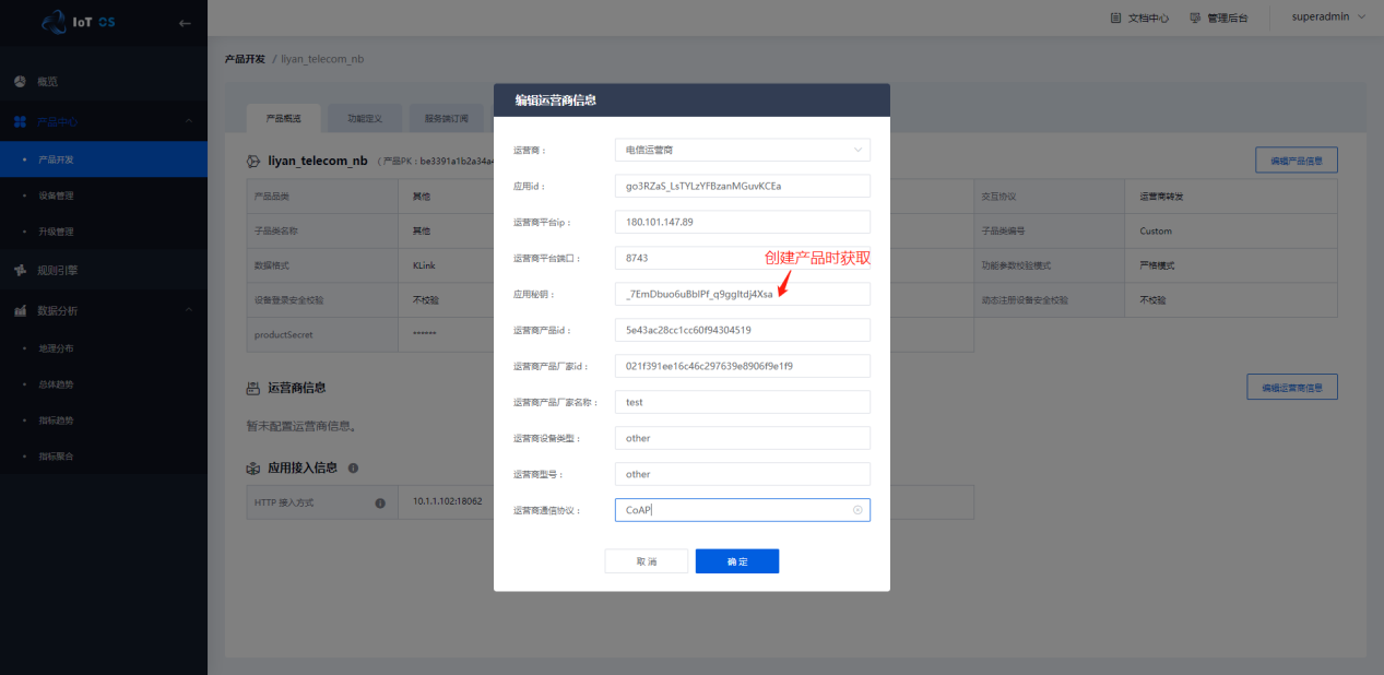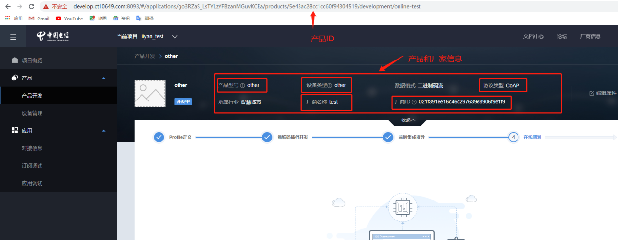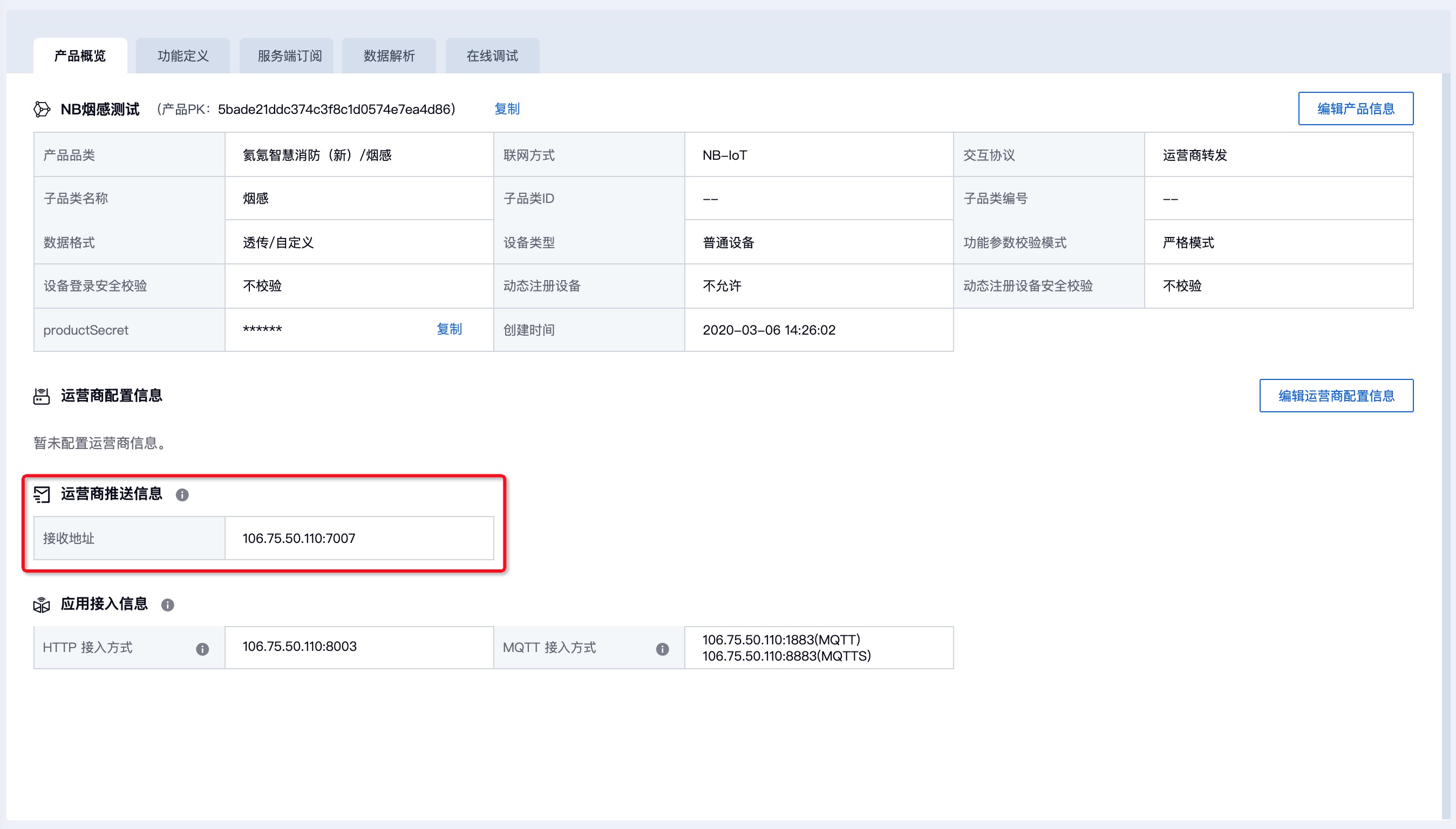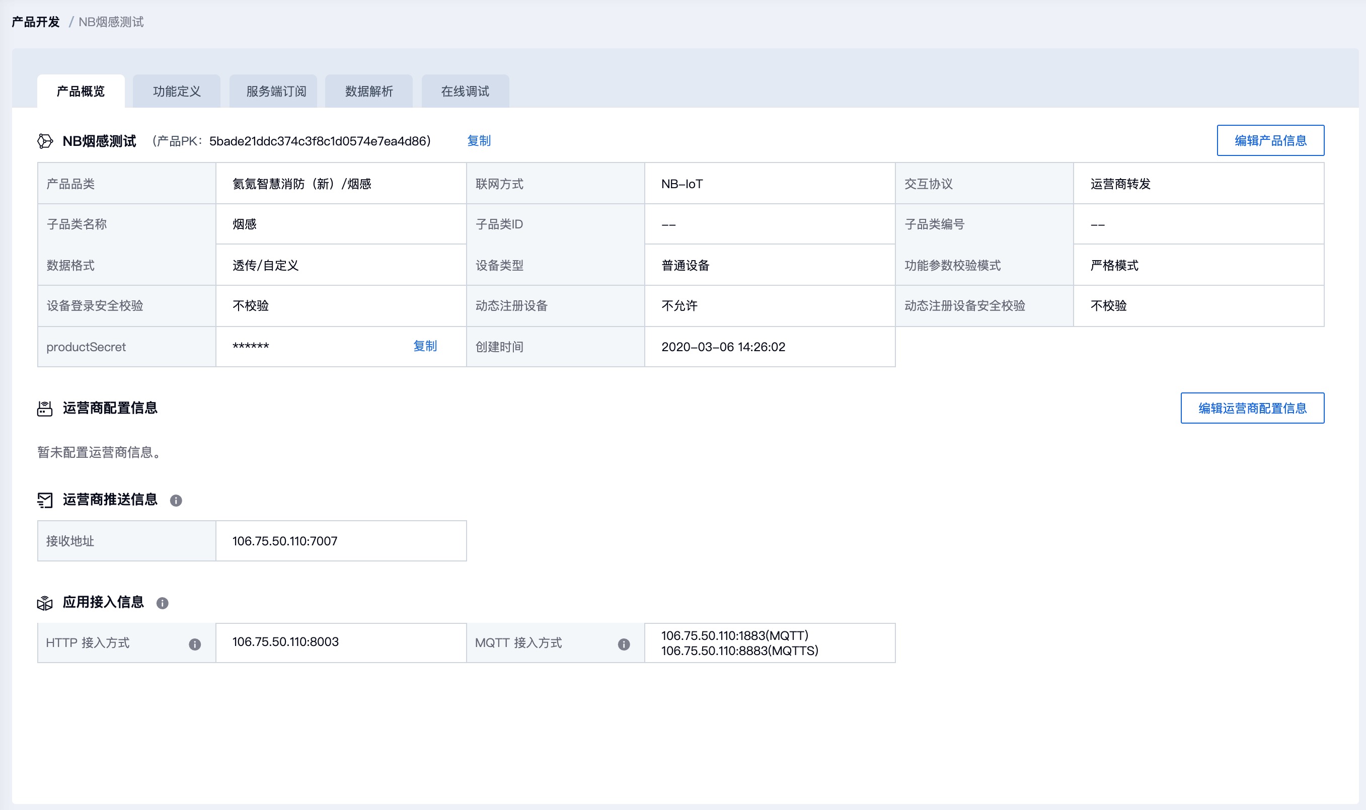 登录运营商平台,进入 产品 - 产品开发 页面,获取 运营商产品ID、运营商产品厂家ID、运营商产品厂家名称、运营商设备类型、运营商产品型号、运营商通信协议 信息,如下图: