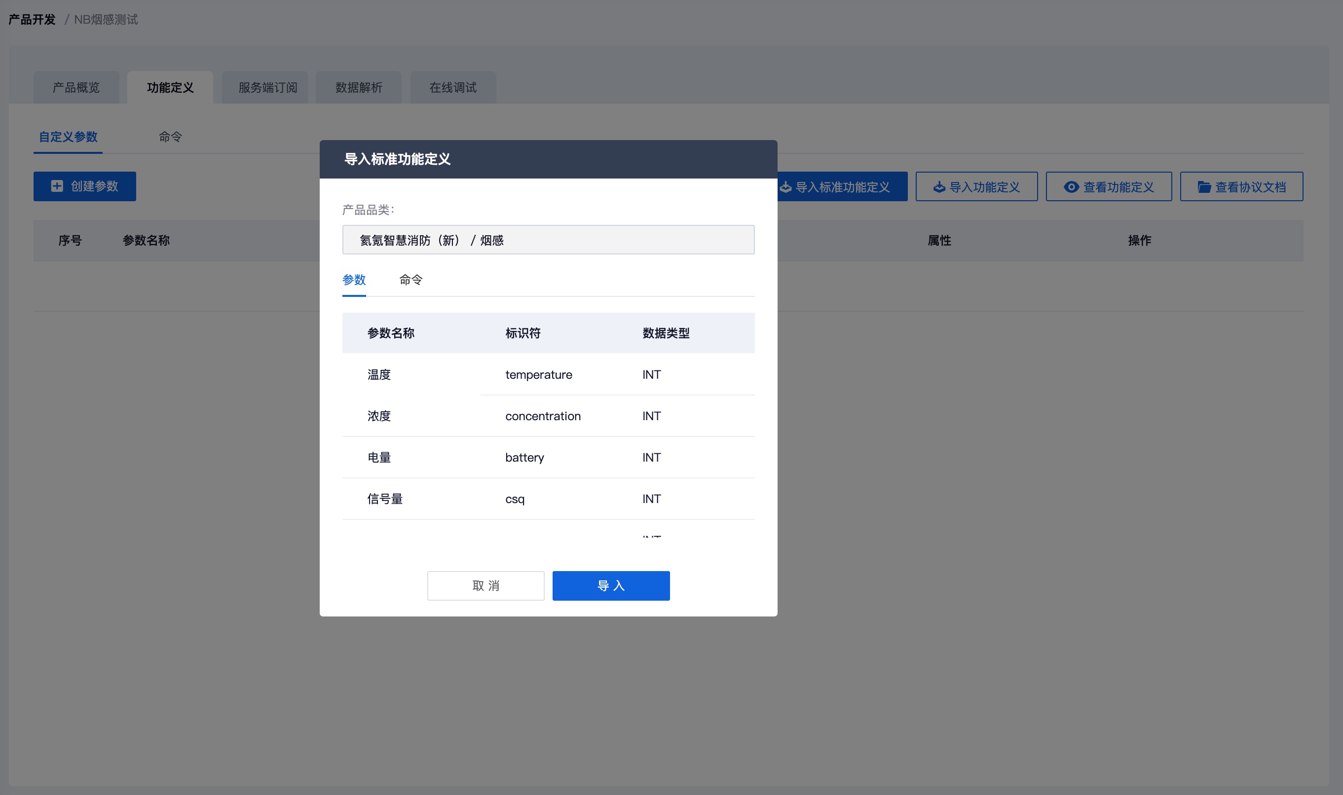 在产品开发页面,点击 功能定义,点击 导入标准功能定义 按钮,IoTOS 预先定义了丰富的物模型方便用户定义产品功能,如下图: