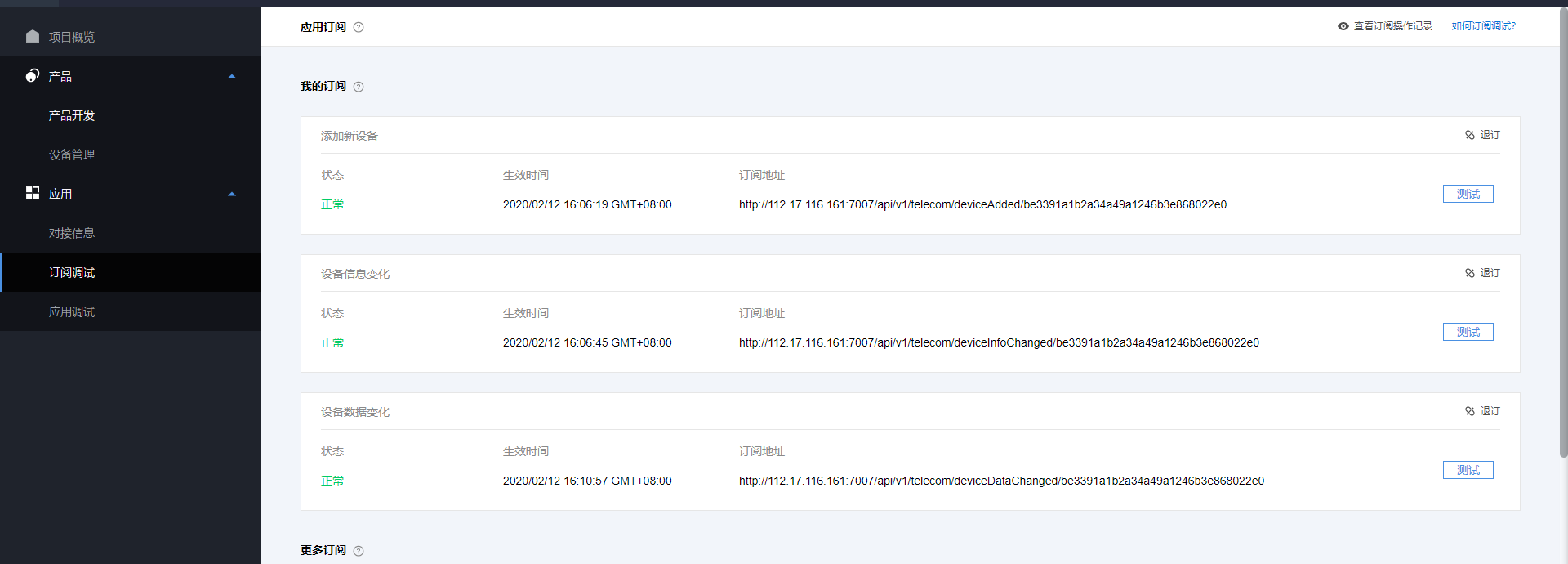 登录运营商平台,进入 应用 - 订阅调试 页面,根据应用数据需要创建应用订阅。