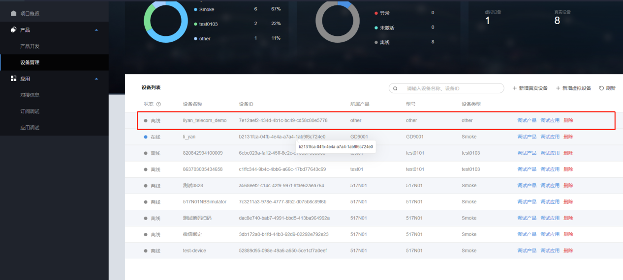 设备在 IoTOS 平台添加完成后,登录运营商平台,进入 产品 - 设备管理 页面,设备已自动添加到设备列表中,如下图: