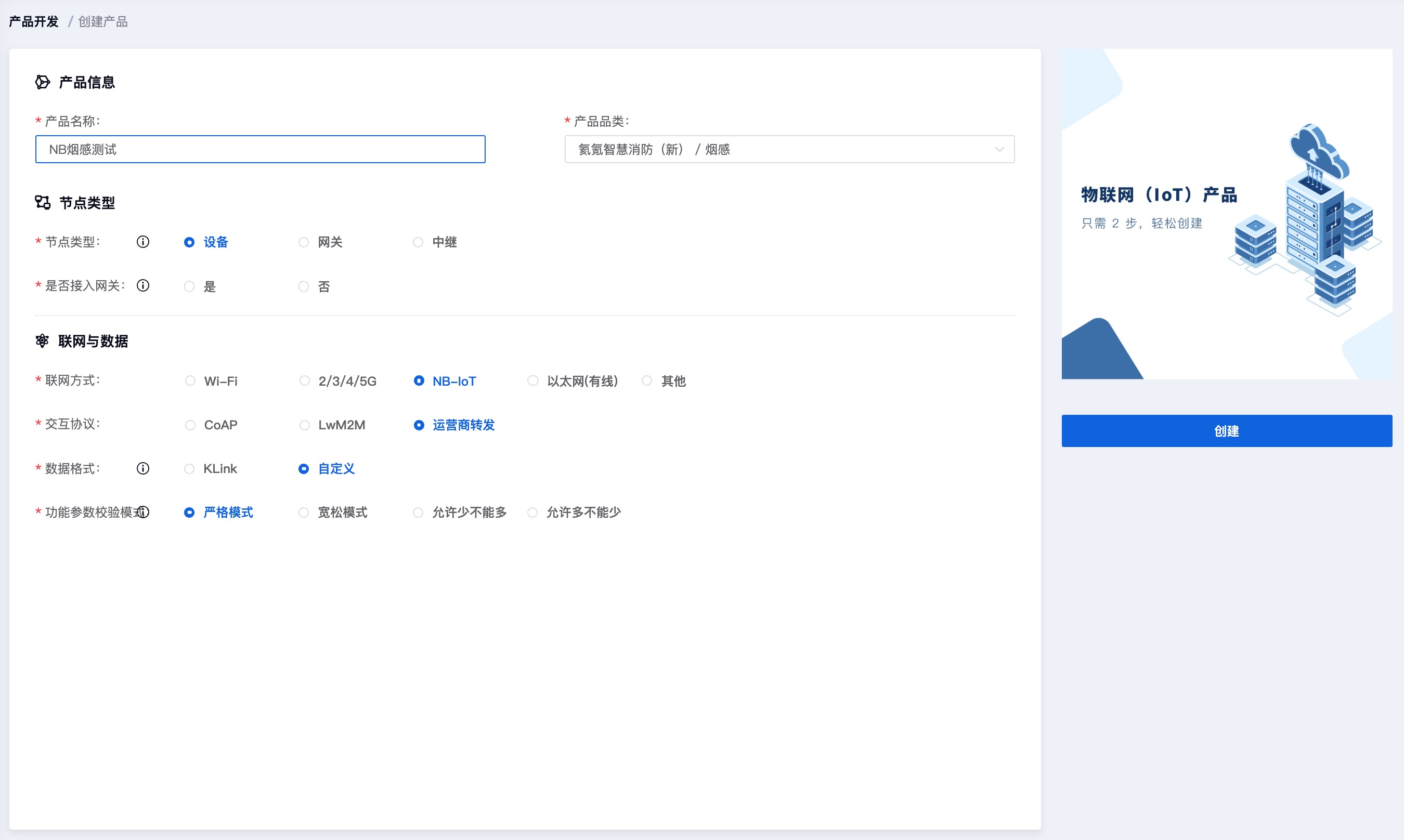 登录 IoTOS 后点击产品中心菜单下的产品开发页面,输入产品信息,如下图: