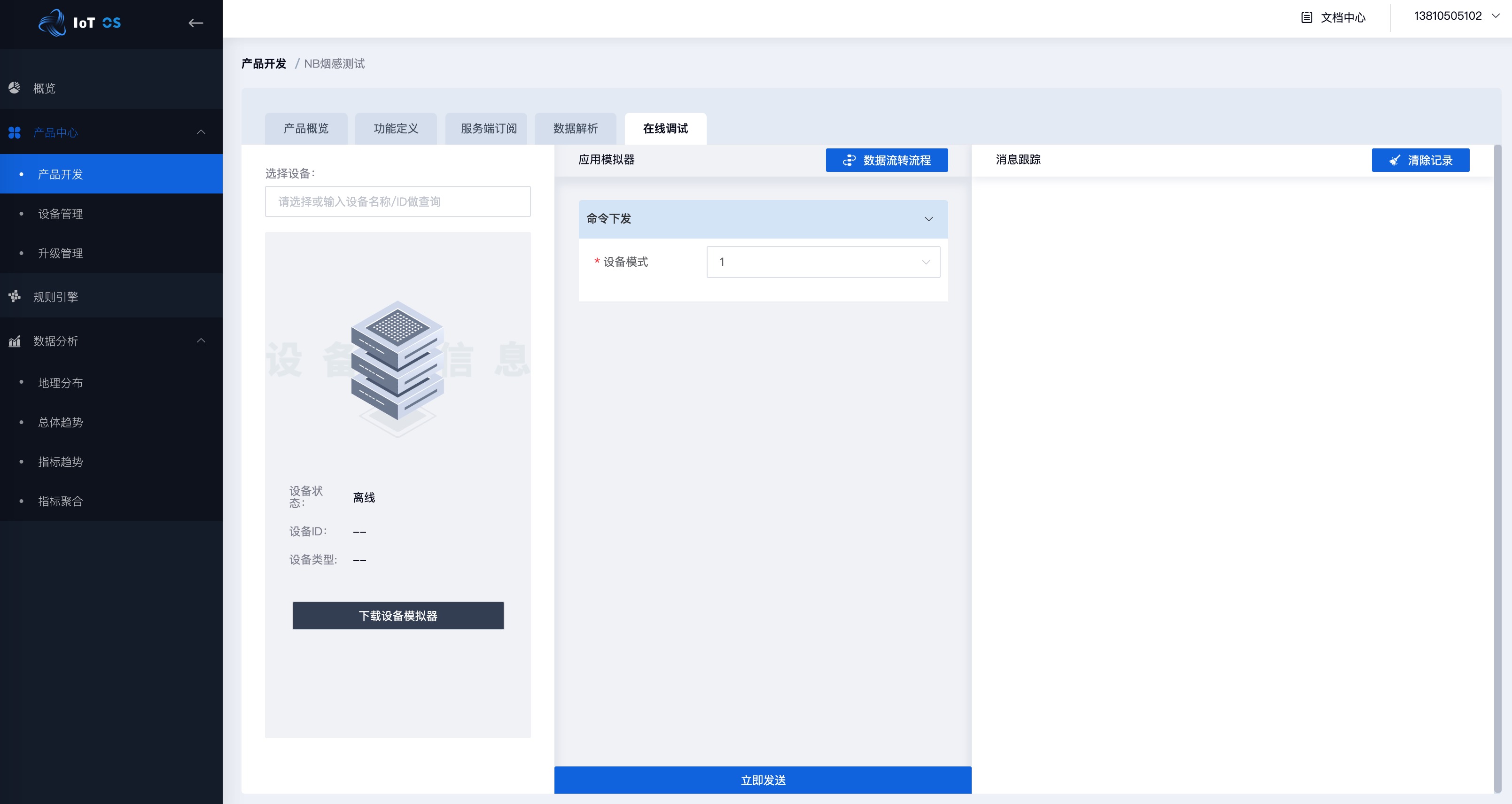 产品、设备都创建好后,可通过平台提供的模拟工具进行设备调试,测试上下行通信数据,确定产品、协议、解析脚本功能是否正确完整。