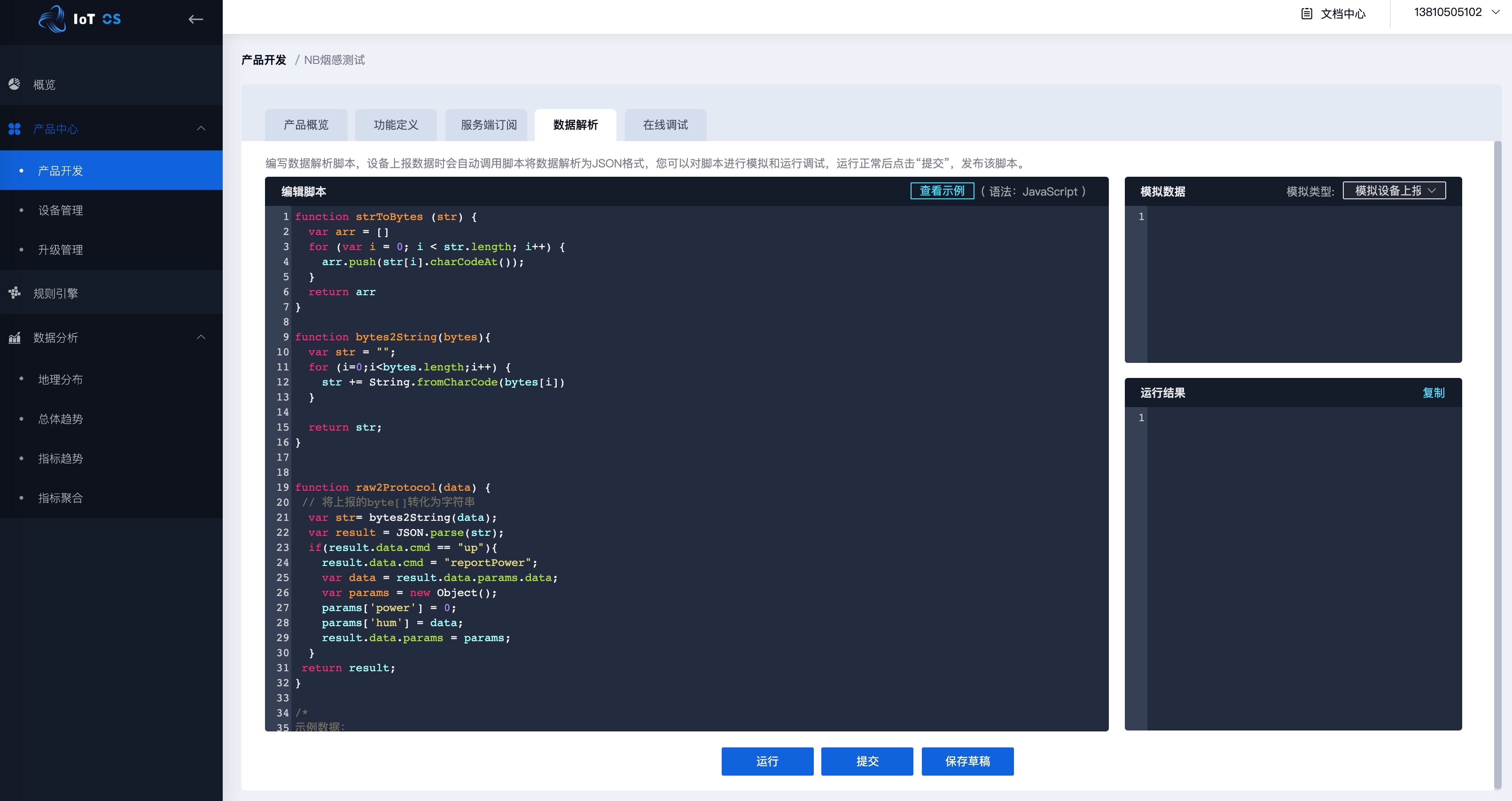 登录 IoTOS 平台后,进入 产品开发 页面,选择要添加数据解析脚本的产品,点击 数据解析 标签。如下图,提供了编辑脚本的输入框,以及模拟数据输入框。