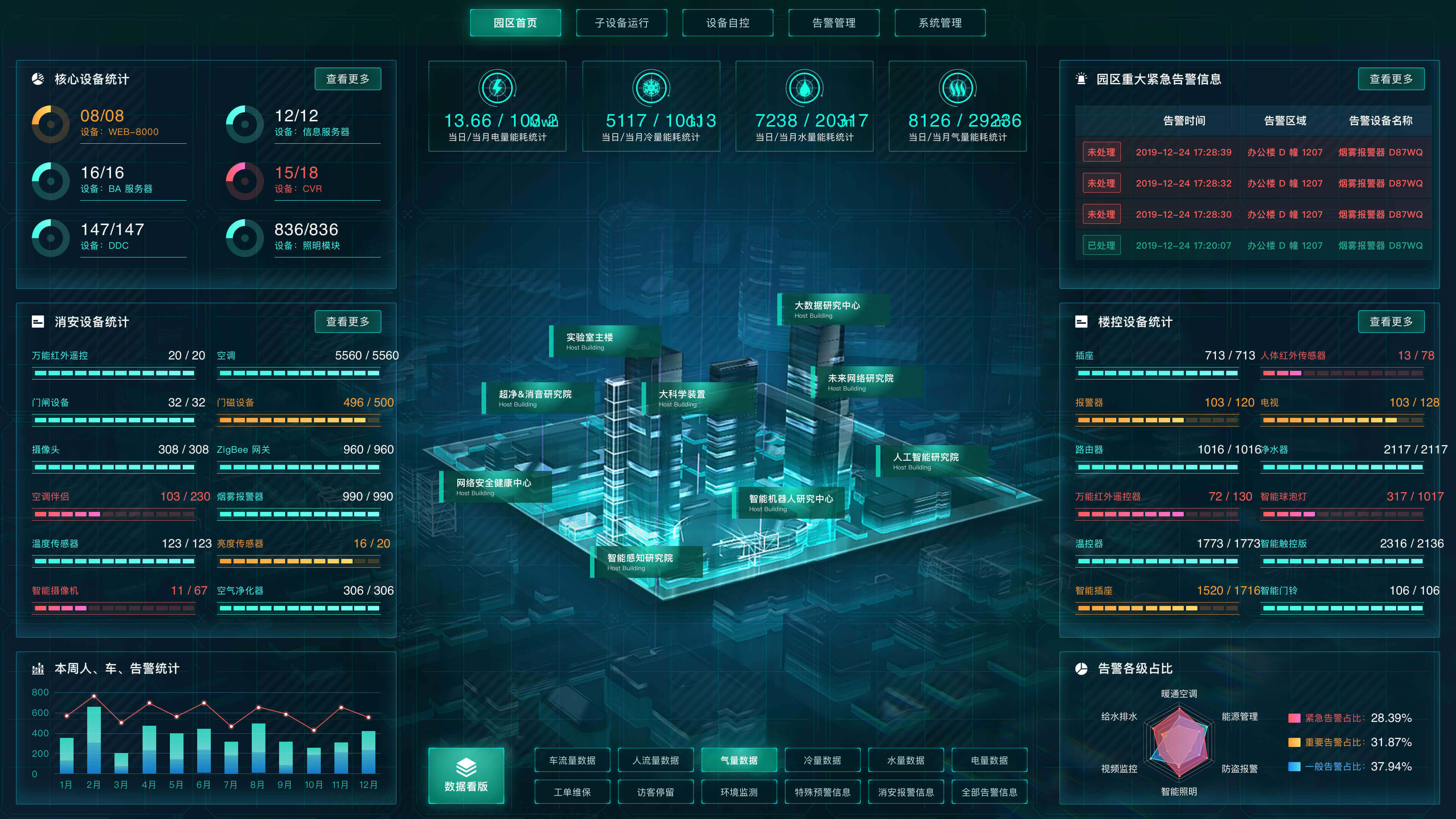 采集汇聚全量数据并进行融合分析,提炼有价值的核心指标,建筑管理者无需登录各子系统,提高运营管理效率,即一平台、一账号、一入口