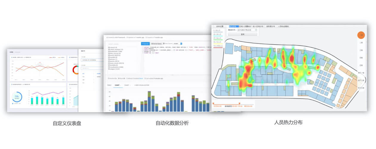 智慧园区综合管理平台设立数据驾驶舱,实现各个智慧子系统的数据分析和部分跨子系统的数据分析,如热力图分布、节能分析等;与大数据存储计算平台打通,提供可视化配置工具关联数据源、分析 SQL 和展现图表样式,满足未来复杂的自定义数据分析需求。
