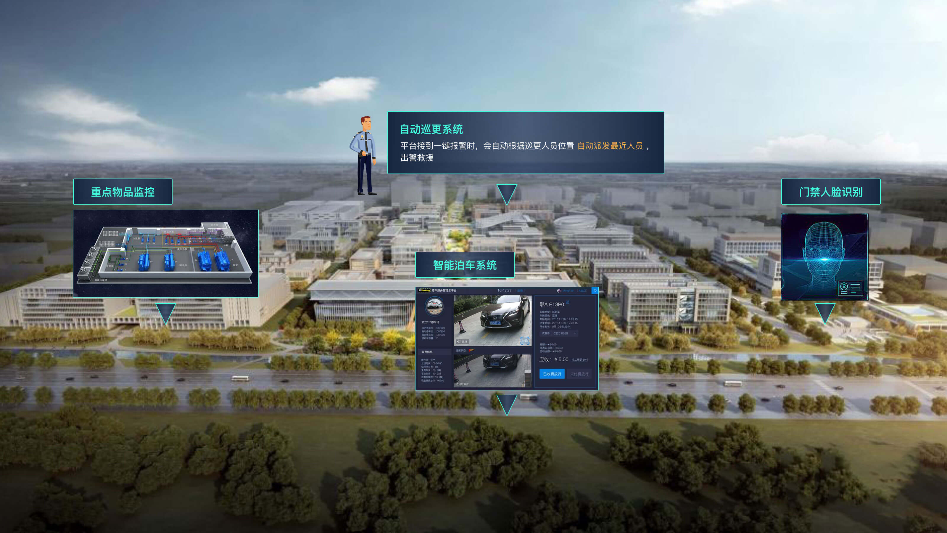 实现视频监控功能,包括周界报警、非法入侵报警、非白名单报警、可疑行为报警、全景监控、巡更系统、人员轨迹追踪、车辆轨迹追踪、移动报警、设备状态监测报警等功能。