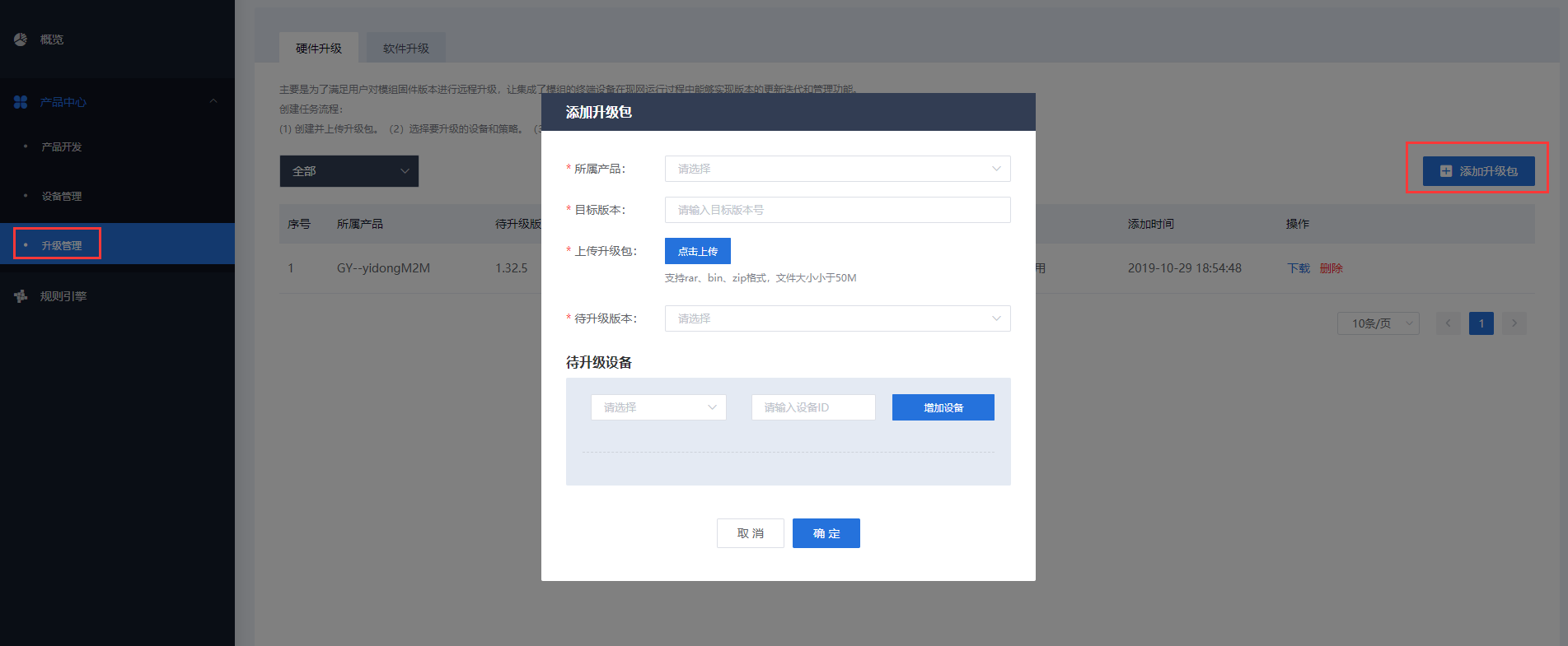 4. 在添加升级包对话框中,输入固件信息,点击确定;