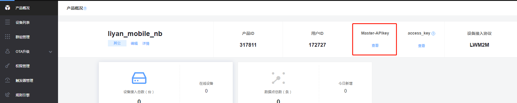 获取Master-APIkey -- 后续IoT OS上配置产品时需要该配置项。