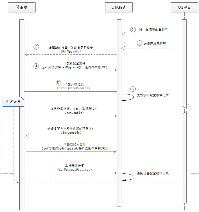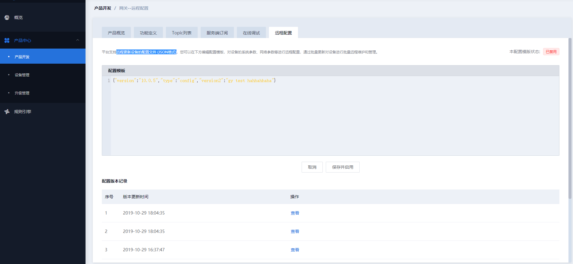 登录平台后,选择左侧导航栏中的“产品开发”,单击要更新配置文件的设备所属的产品,点击“远程配置”标签。在页面配置模板中填写配置文件的脚本(JSON格式),点击“保存并启用”。远程配置规则将被启用,启用后,已在线的设备会马上收到升级任务,离线设备重新上线后需要通过“getConfig”指令主动获取更新任务。远程配置启用后,在“配置版本记录”会记录该条启动记录,用户可查看已启用过的配置任务,点击“恢复此版本”按钮,可查看并启用历史版本。